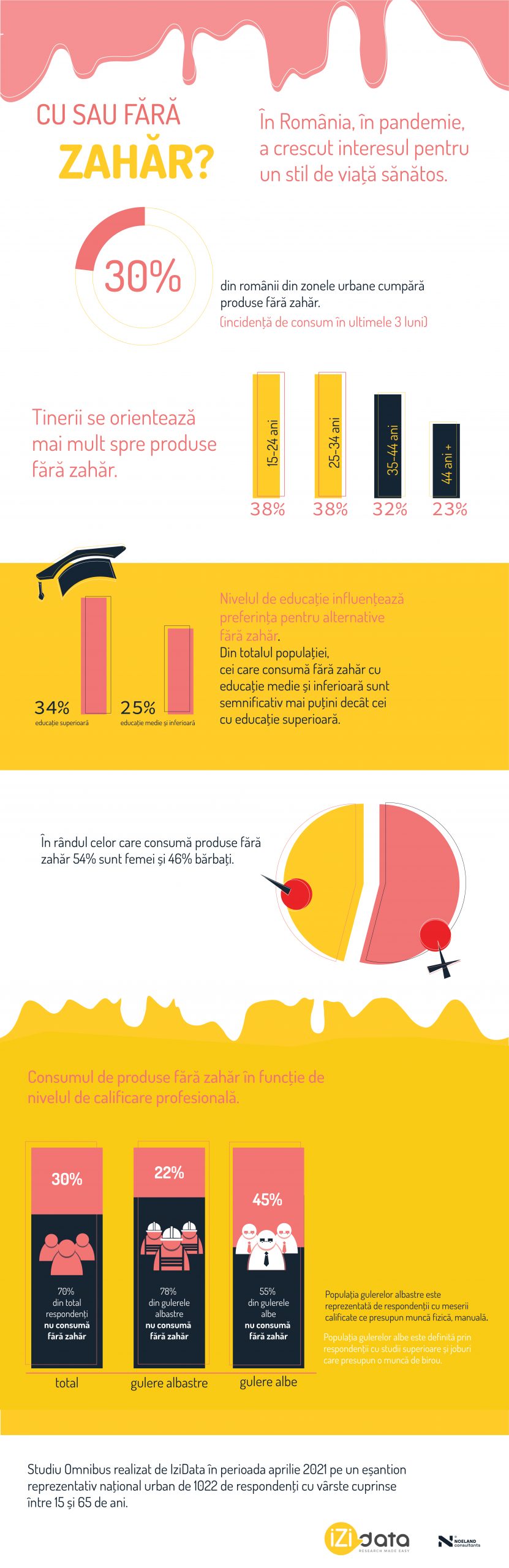 În perioada aprilie – mai a anului 2021, echipa IZI data, cu sprijinul agenției de consultanță strategică Noeland, a realizat un studiu despre consumul produselor fără zahăr și cum a evoluat trendul de alimentație sănătoasă în pandemie. 3 din 10 români din mediul urban consumă (și) dulciuri fără zahăr, tinerii sunt fruntașii clasamentului când vine vorba de alternative la zahăr, cum influențează nivelul de educație preferința pentru alternativele fără zahăr sunt principalele concluzii ale studiului.