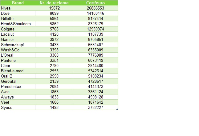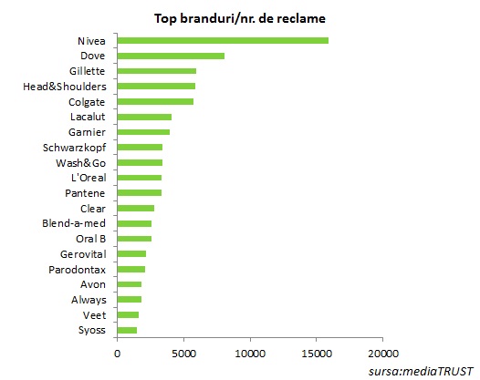 În topul brandurilor de cosmetice și îngrijire personală cu cel mai mare volum de publicitate conduce Nivea cu 15.872 reclame difuzate şi un rate card de aproximativ 26.886.553 de euro. Dove ocupă locul doi în top cu 8.099 reclame, urmat de Gillette cu 5.964 reclame.