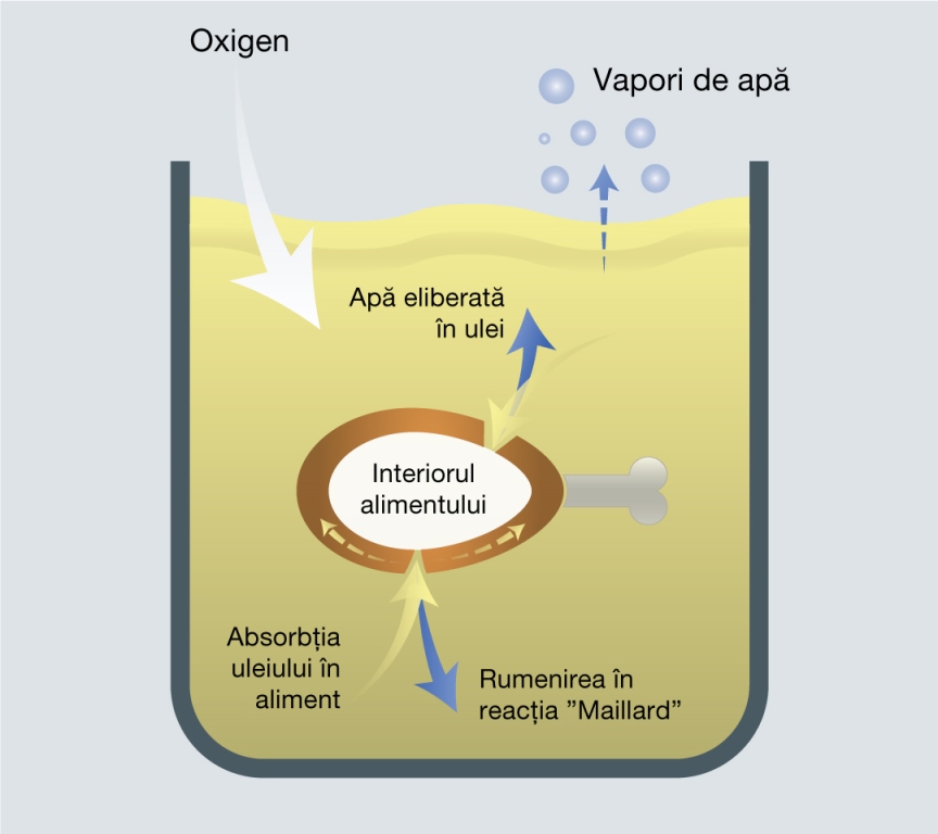 Protejată de abur, pe suprafaţa produsului prăjit se formează o crustă cu un număr mare de pori şi cavităţi. Din moment ce majoritatea apei s-a evaporat, produsul care se prăjeşte, absoarbe uleiul în cavităţile goale, iar interiorul este gătit.